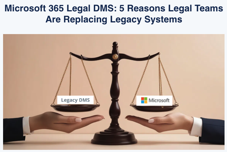 Legacy legal document management systems are being re-evaluated as legal teams modernize their workflows. Learn more about the 5 key reasons legal departments and law firms are moving from legacy DMS platforms to a Microsoft 365-centric approach — including improving governance, reducing complexity, and enhancing daily efficiency.